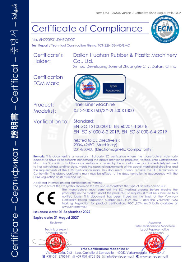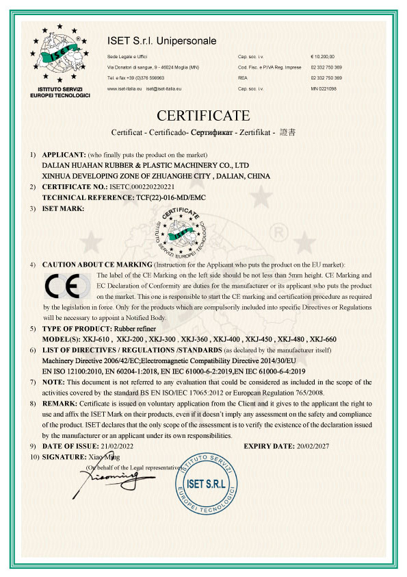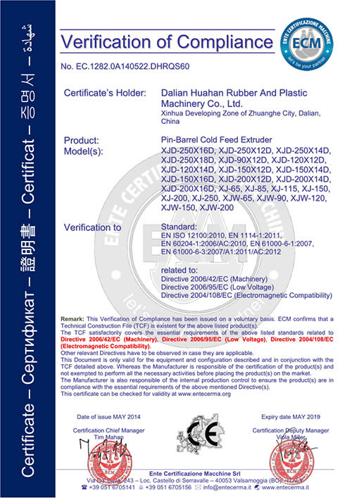 Certificate Content: 2.The Rubber Extruder of Dalian HUHAN has passed the verification standard:EN ISO12100:2010, EN 1114-1:2011, EN 60204-1:2006/AC:2010, EN 61000-6-1:2007, EN 61000-6-3:2007/A1:2011/AC:2012 ralated to : Directive 2006/42/EC(Machinery) Directive 2006/95/EC(Low Voltage) Directive 2004/108/EC(Electromagnetic Compatibility)