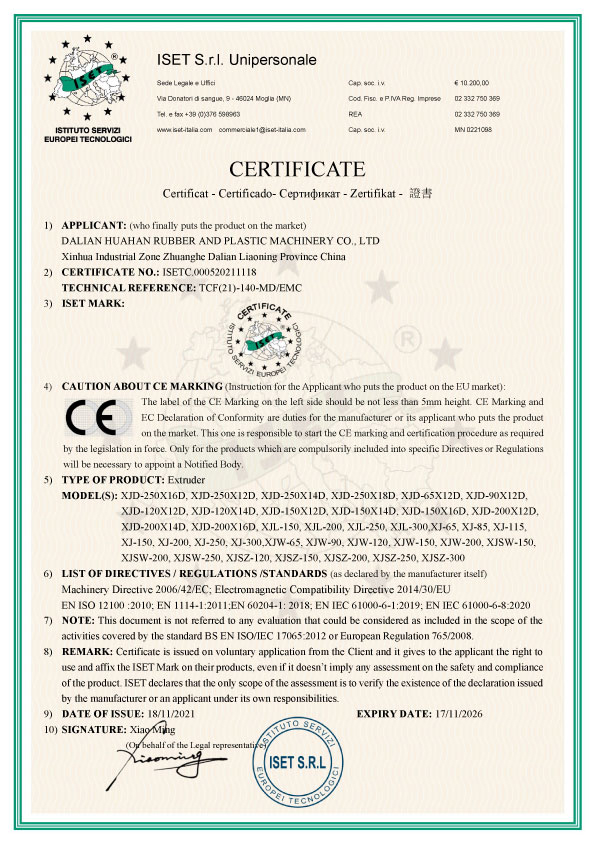 Purpose of Certificate: The Extruder of Dalian HUHAN has passed the CE verification standard