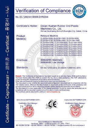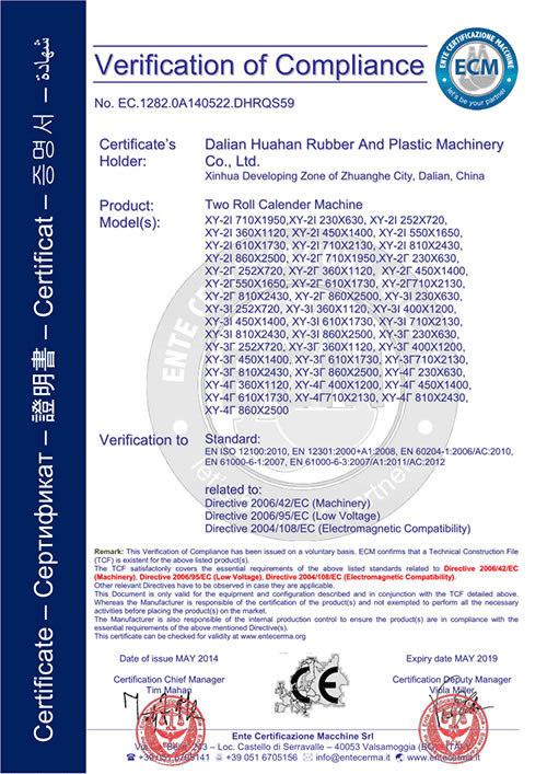 Certificate Content: The Two Roll Calender Machine of Dalian HUHAN has passed the verification standard:EN ISO12100:2010, EN 12301:2000+A1:2008, EN 60204-1:2006/AC:2010, EN 61000-6-1:2007,,EN 61000-6-3:2007/A1:2011/AC:2012 ralated to : Directive 2006/42/EC(Machinery) Directive 2006/95/EC(Low Voltage) Directive 2004/108/EC(Electromagnetic Compatibility)