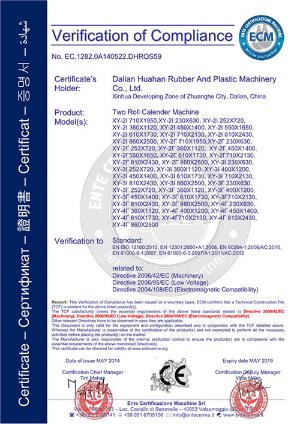 P urpose of Certificate: The Two Roll Calender Machine of Dalian HUHAN has passed the CE verification standard