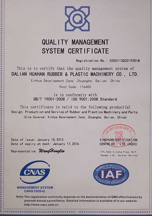 Certificate Content: This is to certify that the quality management system of Dalian Huahan Rubber&Plastic Machinery Co., Ltd. is in compliance with GB/T 19001-2008 / ISO 9001: 2008 standards. This certificate is valid to the following product(s), design, production, service of rubber and plastics machinery and parts. Site covered is Xinhua Development Zone, Zhuanghe, Dalian, China.
