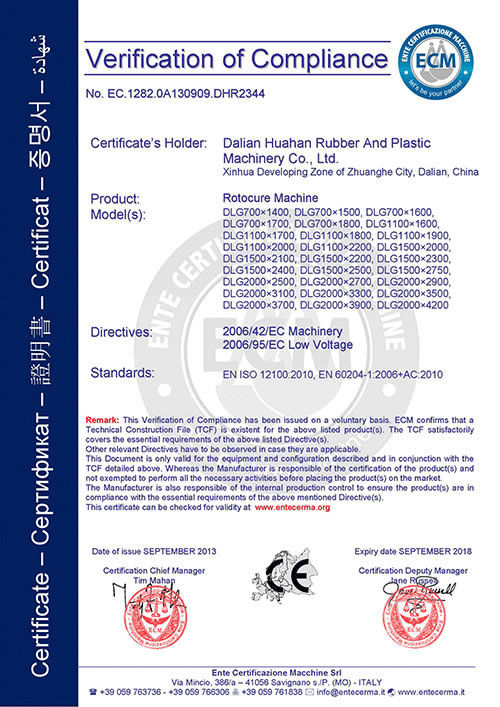 Certificate Content: The Rotocure Machine of Dalian HUHAN has passed the directives:2006/42/EC(Machinery),2006/95/EC(Low Voltage) and standards:EN ISO12100:2010, EN 60204-1:2006+AC:2010